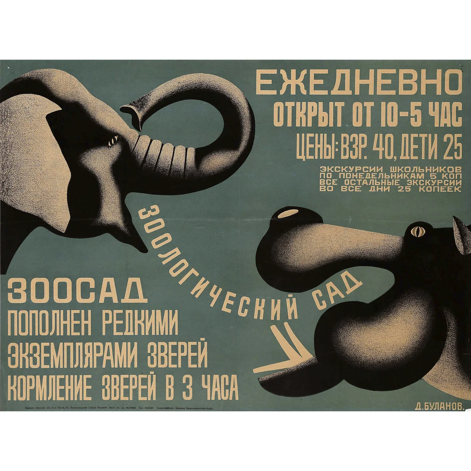 Upon his return to Petrograd in 1923, Bulanov took on various government roles simultaneously and was also appointed Head of the Art Department of the journal Zhizn’ iskusstva (Life of Art). In August 1926, he became Art Director of the State Advertising Agency (Gosudarstvennoe Biuro reklam) of Leningrad’s Department of Communal Services (Gubotkomkhoz), for which he designed various posters. Beginning in 1928, he produced brochures and posters for the Leningrad Zoo. These posters were so well received that Bulanov employed assistants to help implement his ideas. In the 1920s, Bulanov also produced social and political posters for International Red Aid (MOPR) and children’s books for various publishing houses.